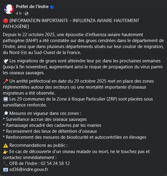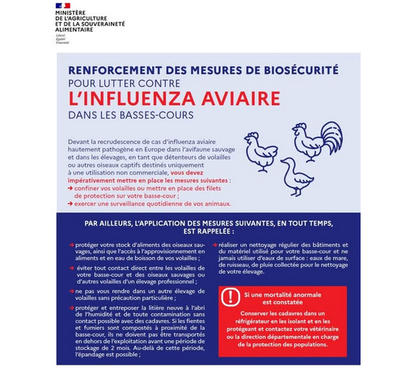 A compter du 22 octobre 2025, les mesures de prévention et de biosécurité sont obligatoires sur l’ensemble du territoire :