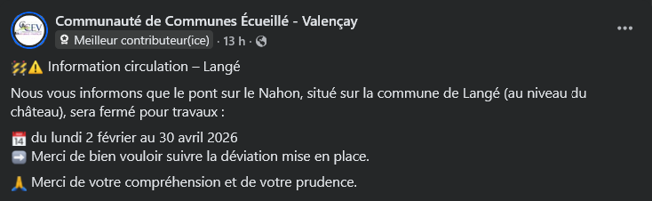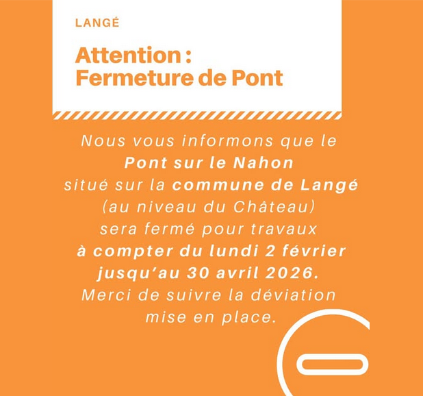ORANGE ayant prévu des travaux à LANGÉ, ses services (internet et fixe) pourraient être perturbés le vendredi 30 janvier 2026 de 8 à 12 heures.