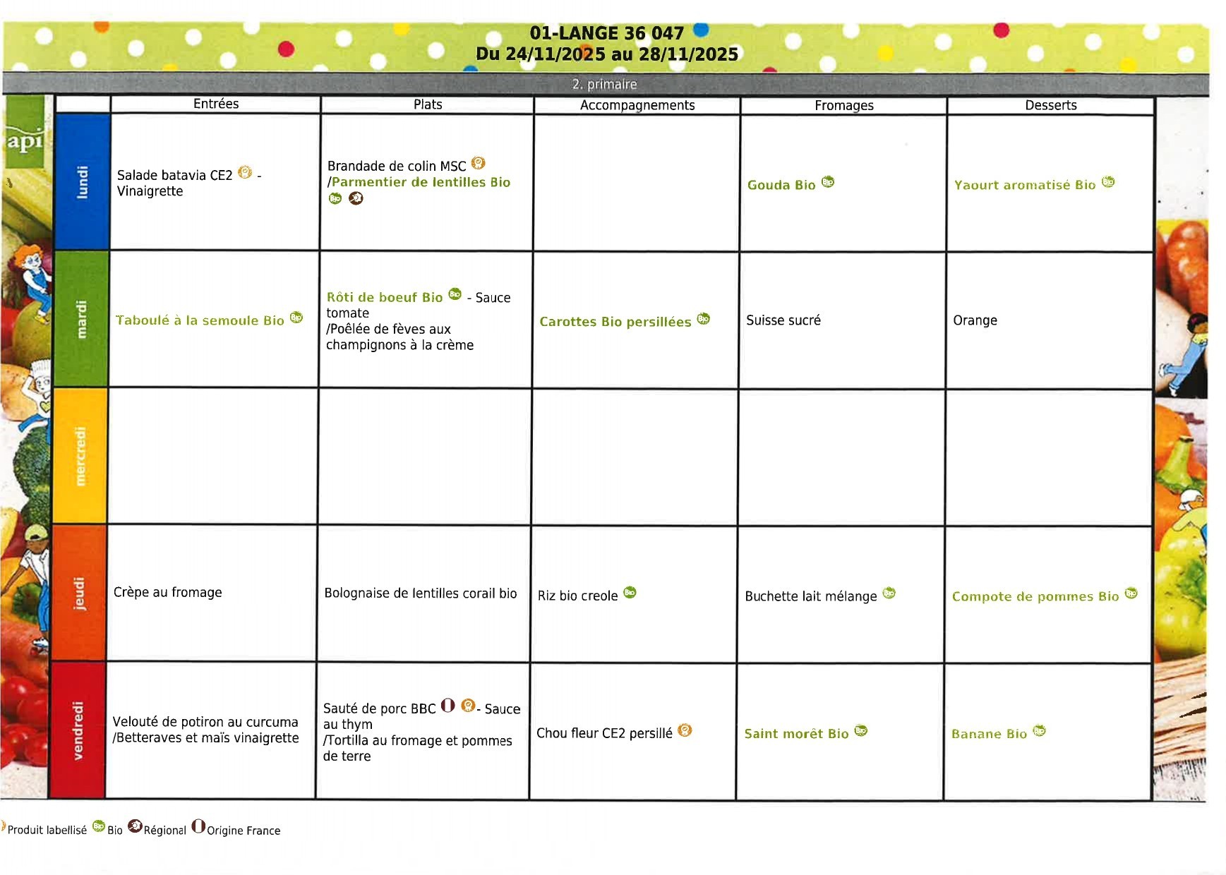 Menus du 24 au 28 novembre 2025
