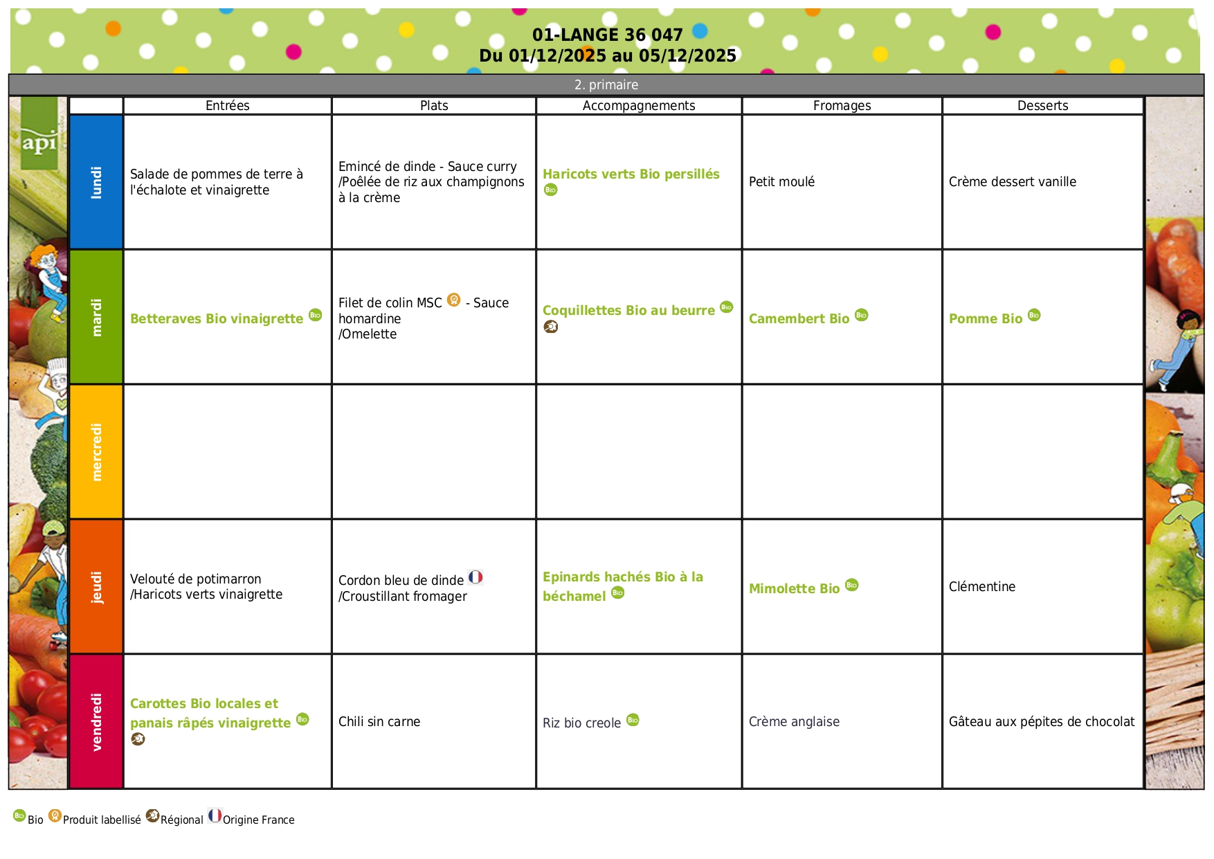 Menus du 01 au 05 décembre 2025