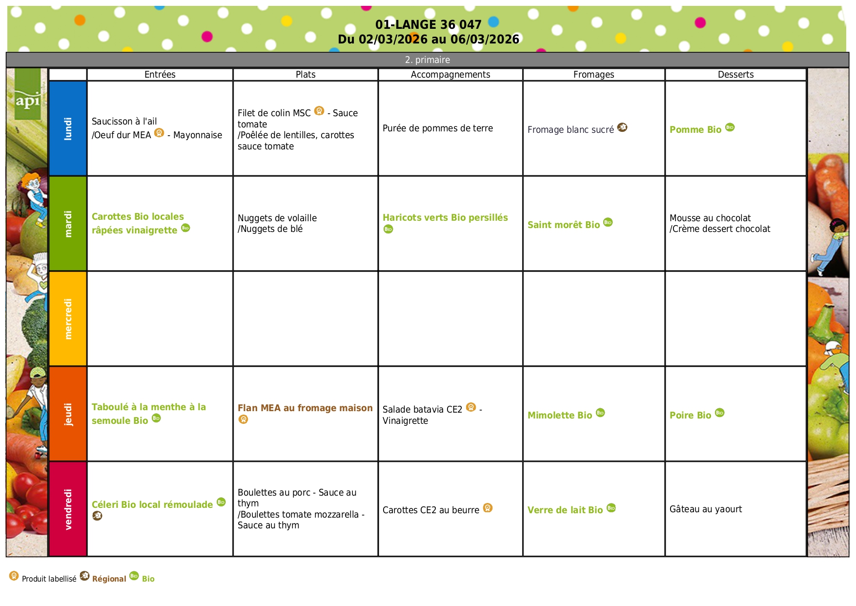 Menus de la cantine