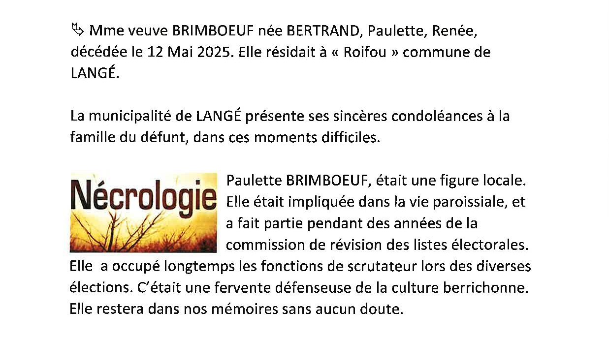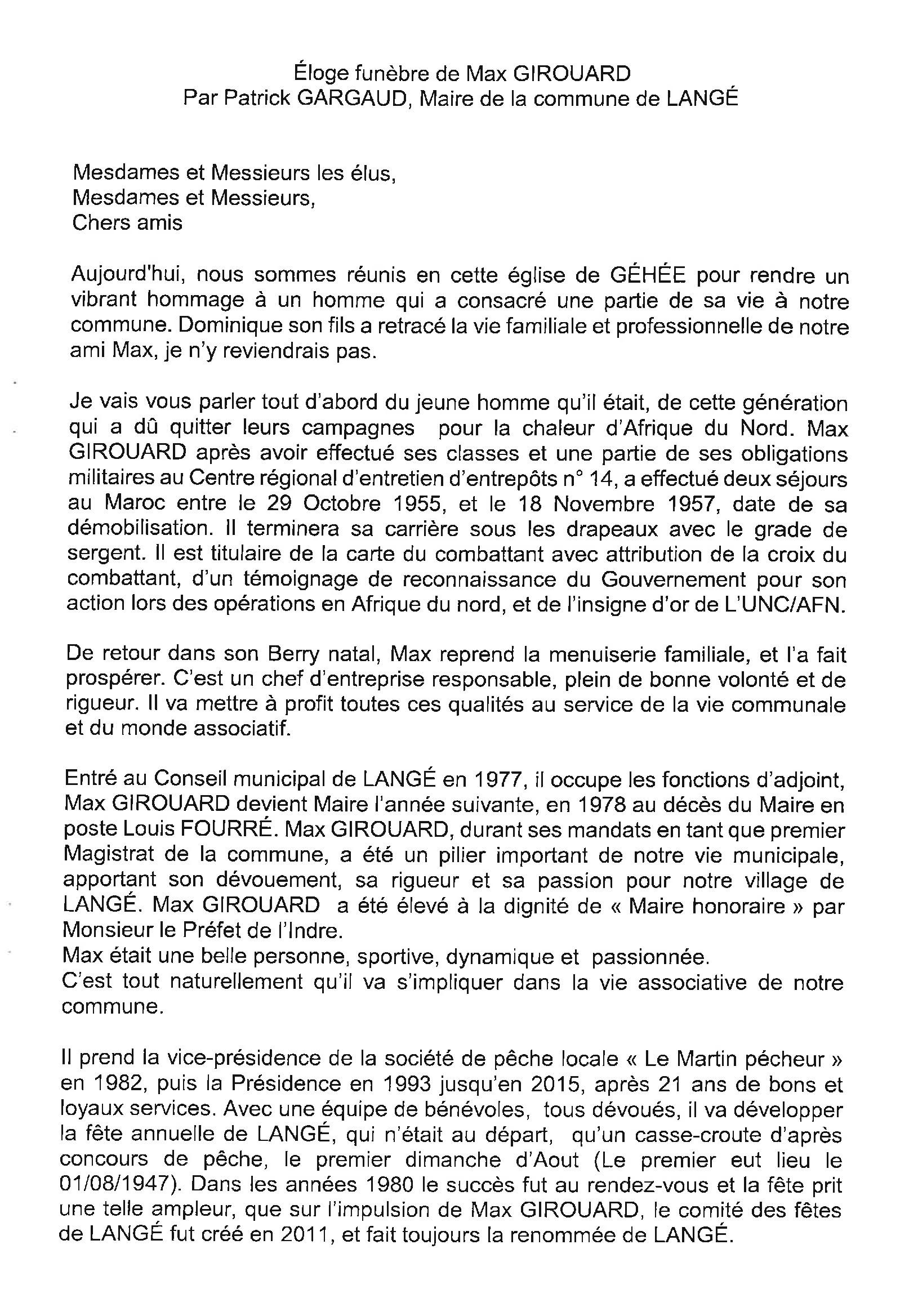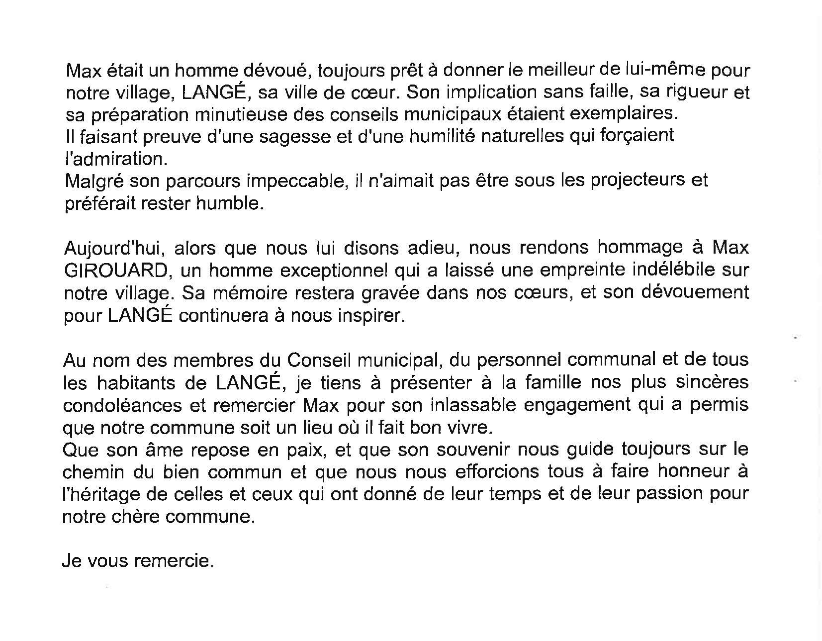 Le maire Patrick Gargaud, les conseillers municipaux et les employés communaux de LANGE ont le regret de vous annoncer le décès le 18 mai 2023 de Max MAIGRET adjoint au maire, conseiller municipal depuis 1983